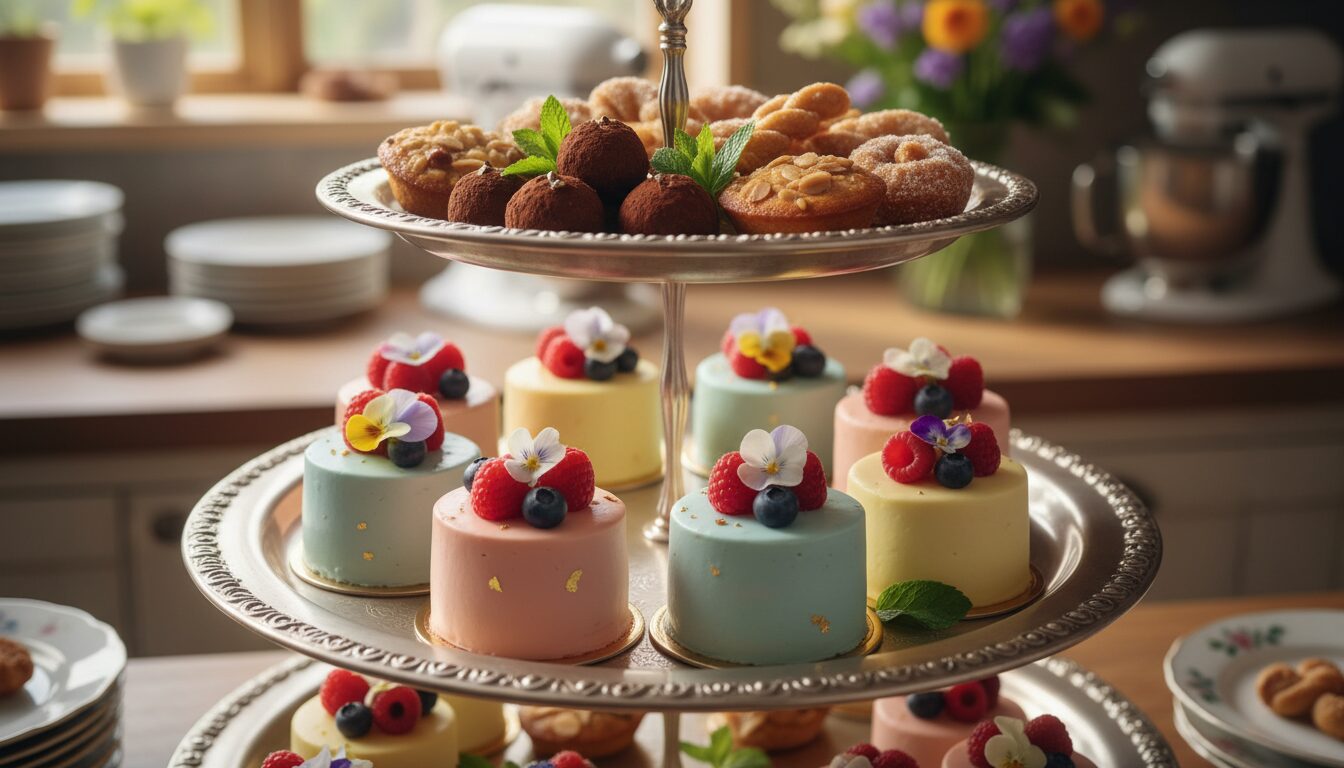 Ekskluzivni kolači sa zlatnom folijom ili pastelnim motivima daju notu istinske elegancije. Dobra organizacija visina i oblika na tacni čini svaku porciju vizuelno neodoljivom i profesionalnom.