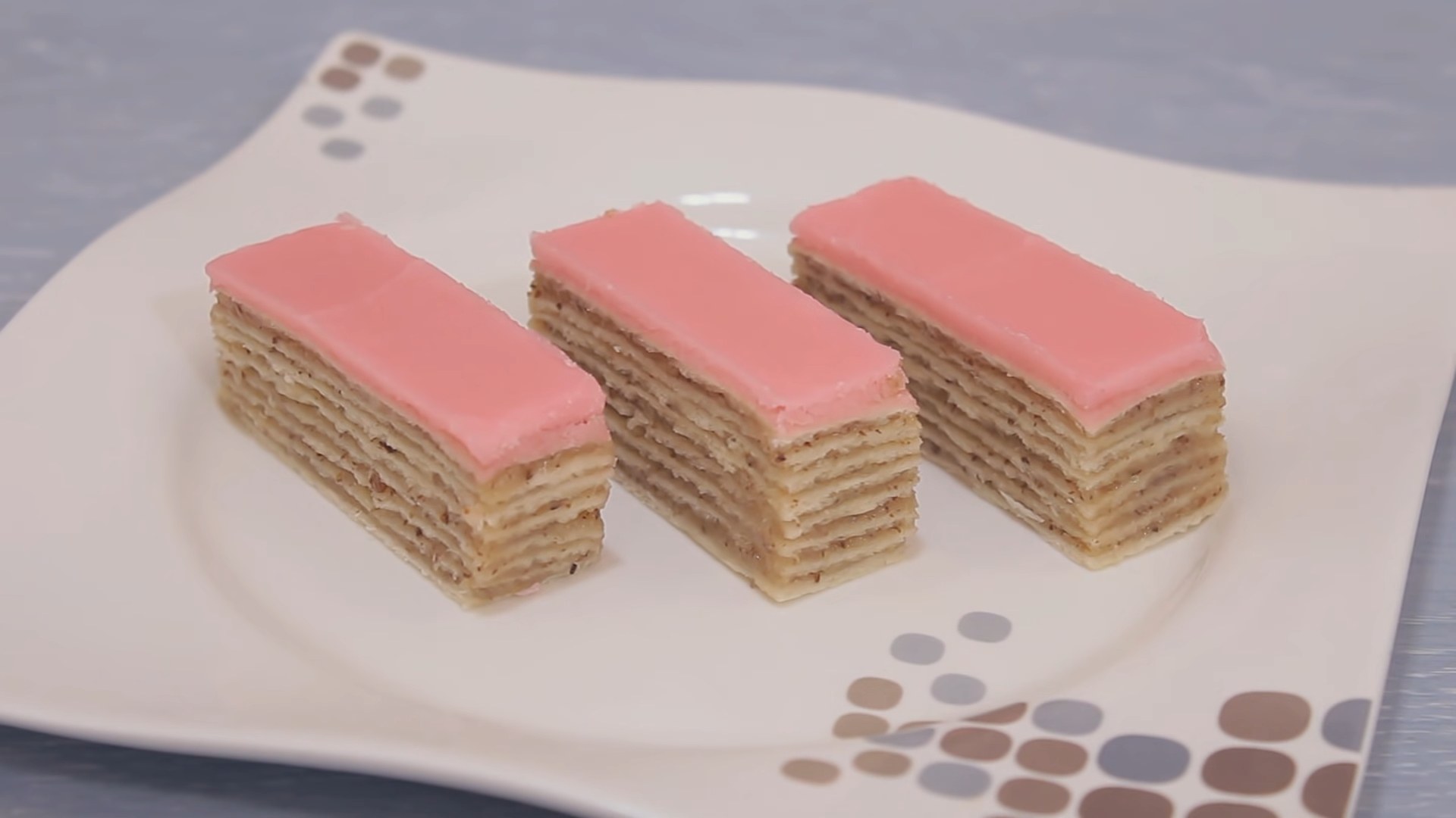 Parče rozen torte sa tankim slojevima i roze glazurom